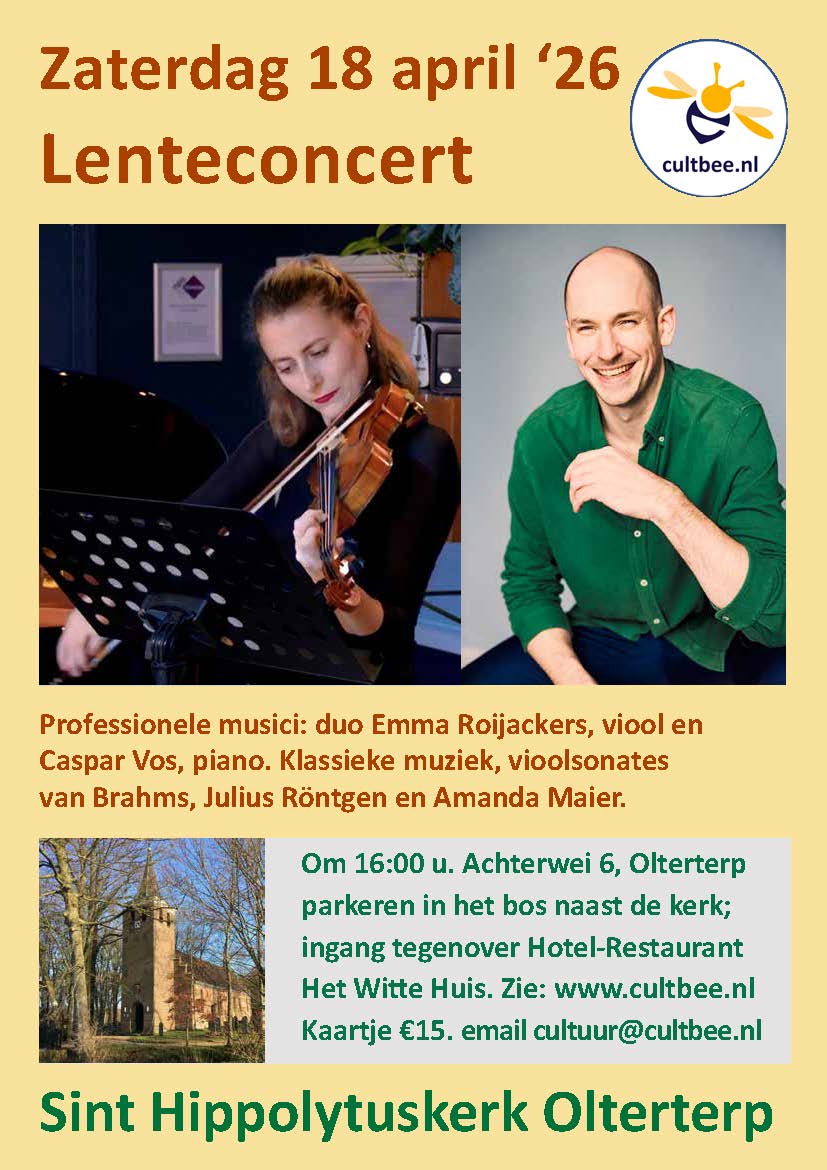 Op zaterdag 18 april 2026 vindt om 16:00 uur het klassieke Lenteconcert plaats in de St. Hippolytuskerk in Olterterp (vlakbij Beetsterzwaag). Het concert wordt uitgevoerd door de professionele musici Emma Roijackers op viool en Caspar Vos op piano. Zij zullen klassieke kamermuziek spelen, waaronder vioolsonates van onder andere Johannes Brahms. Meer informatie is te vinden op www.cultbee.nl. Reserveren wordt aanbevolen!