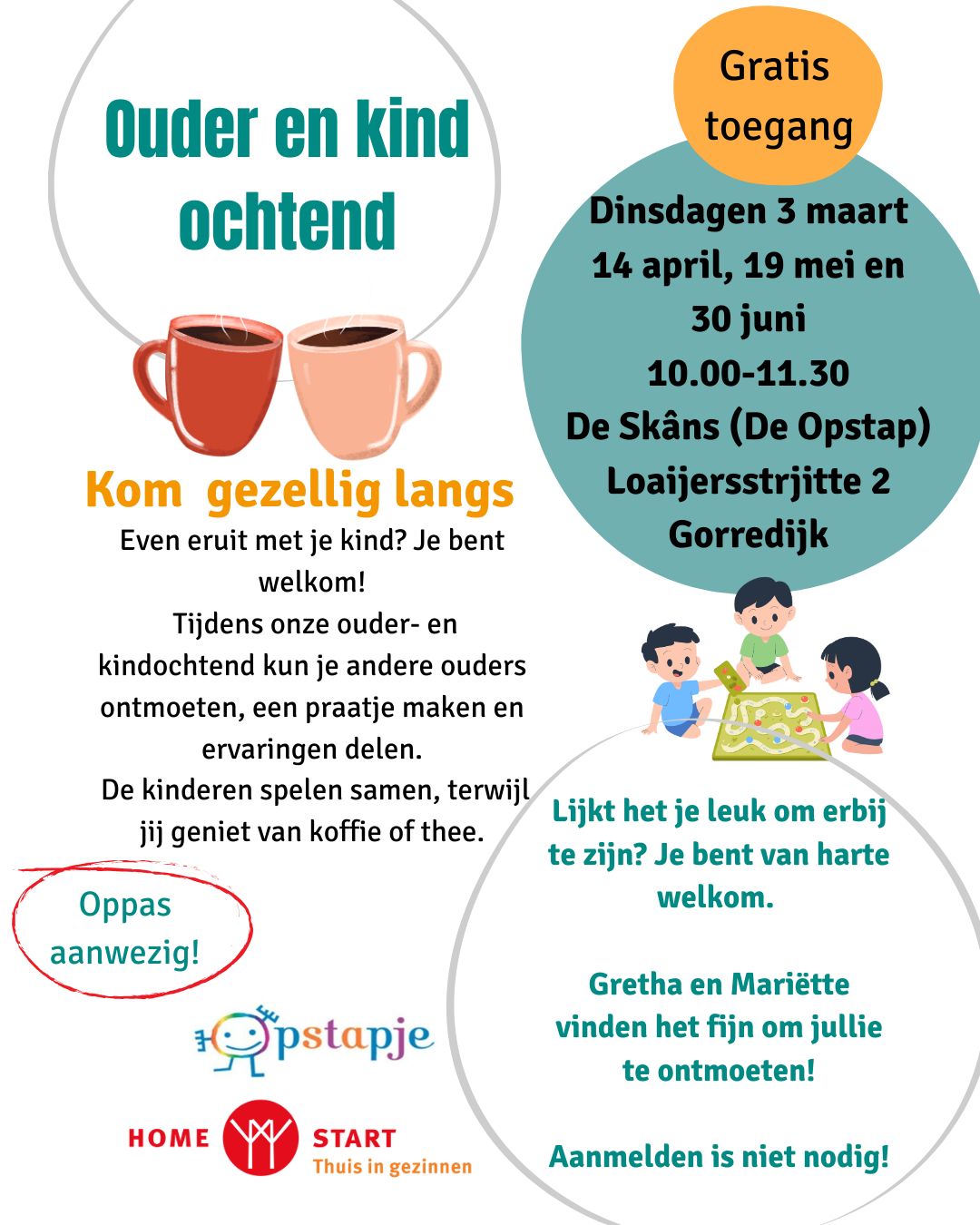 Je bent welkom met je kind(eren), maar ook als je alleen wilt aanschuiven voor een kop koffie en een praatje.
