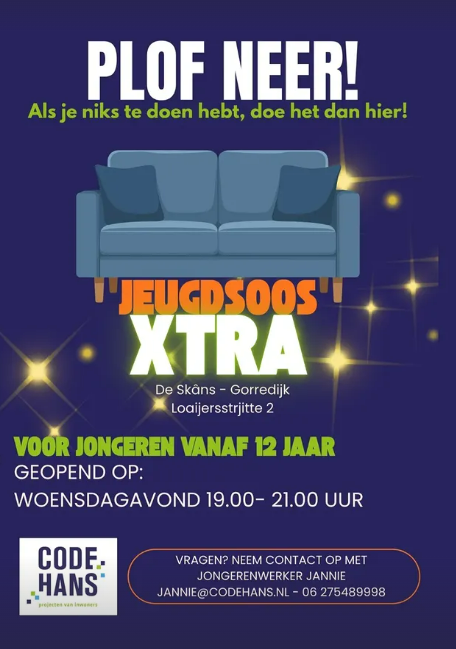 Elke woensdagavond van 19.00 tot 21.00 uur in de jeugdsoos in de Skans Gorredijk.
