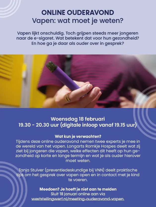Tijdens deze online ouderavond nemen twee experts je mee in de wereld van het vapen.