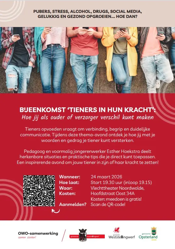 Deze avond wordt georganiseerd door de OWO-gemeenten; Opsterland, Weststellingwerf en Ooststellingwerf in het kader van OKO Opgroeien in Kansrijke Omgeving. Wilt u meer weten over OKO, meedenken of heeft u een idee meldt u dan aan bij uw eigen gemeente. Voor Opsterland: https://www.opsterland.nl/opgroeien-in-een-kansrijke-omgeving
